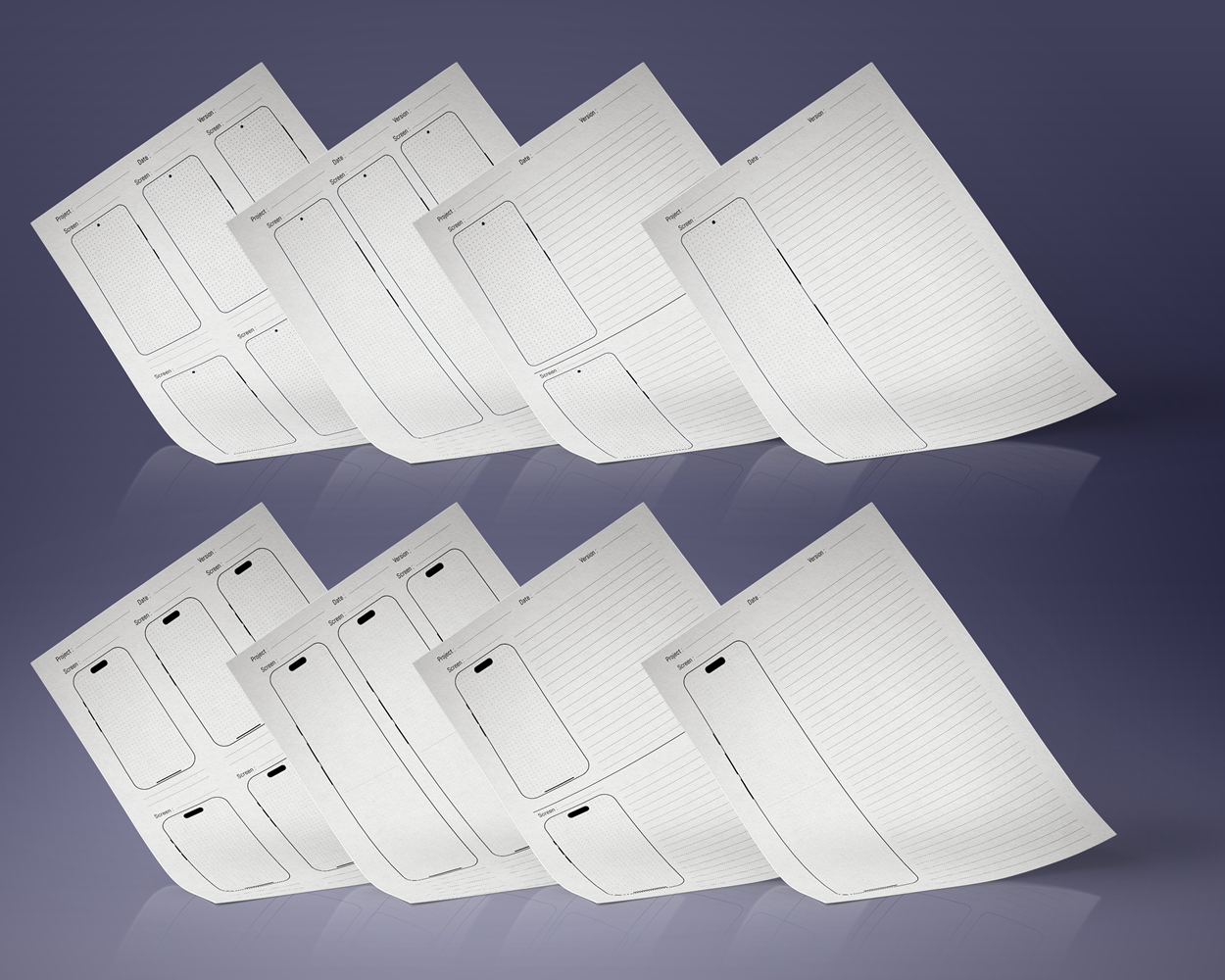 Available in both A4 and Letter sizes, this sketchbook is ideal for brainstorming, planning, and refining mobile app designs. The pre-organized pages make it easy to keep track of project versions and screen iterations, providing a professional yet flexible framework.